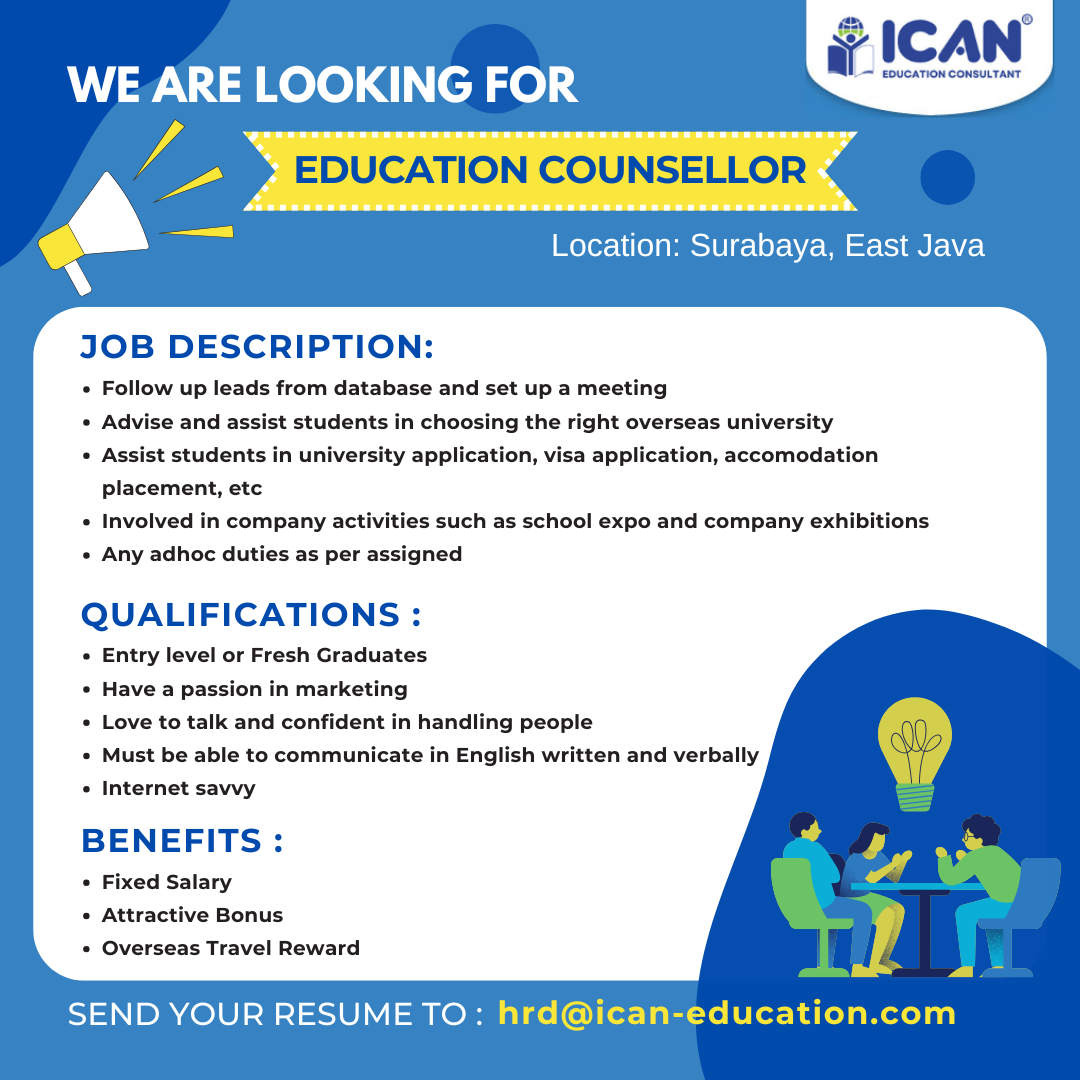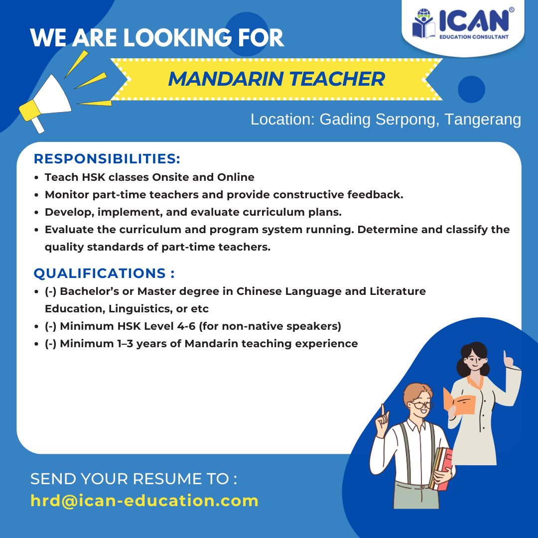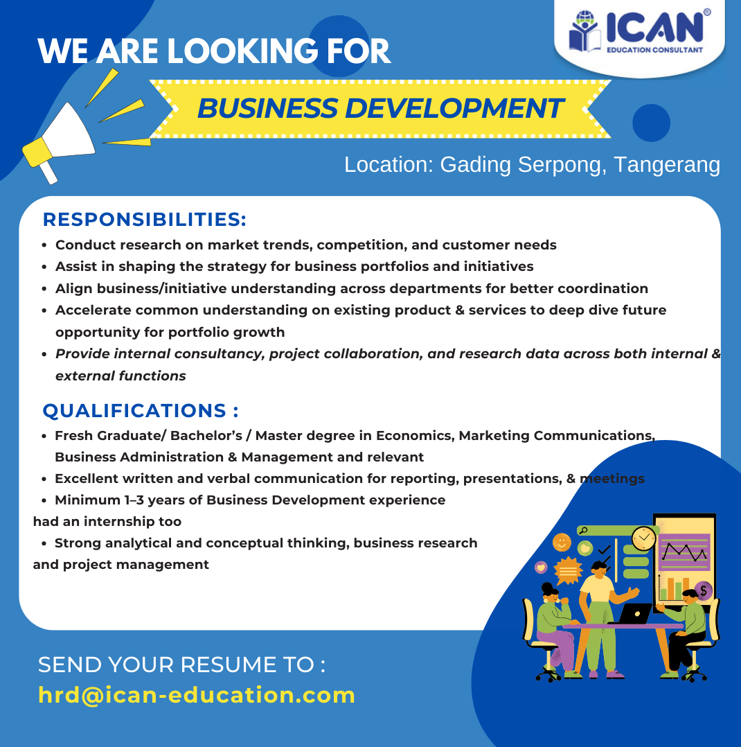 Lowongan | 24 Nopember 2025 00:00 wib kami ICAN Education membutuhkan kandidat – kandidat yang potensial dan profesional dari Mahasiswa/siswi Universitas Padjajaran dan juga dari lulusan terbaik dari Universitas Padjajaran. Sehubungan dengan kebutuhan tersebut , melalui surat ini kami menyampaikan permohonan kerjasama untuk campus hiring, melakukan kegiatan pemasangan iklan lowongan kerja. Adapun Lowongan kerja full time yang kami butuhkan saat ini, yaitu sebagai berikut: 1. Mandarin Teacher Full-time (Gading Serpong) 2. Business Development Full-time (Gading Serpong) 3. Education Counselor (Surabaya)